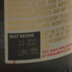 So, check the date. Some breweries, like Brouwerij Moortgat, the makers of Duvel, print a “best before” date somewhere on the label, usually on the back or the neck. Others print the date the beer was bottled, which leaves you to guess how long is too long. There’s no scientifically determined expiration date for beer, but there’re a few rules of thumb. Lighter brews go skunky quicker, so if you’re picking out something especially delicate, like a Weihenstephaner Kristall Weissbier, you’ll want to make sure it’s no more than six months old. Nine months you’re getting into extremely iffy territory, and a year, well, you’ve been warned. Slightly heavier brews like pilseners, pale ales, and bigger wheat beers may be good for a few months longer. Doppelbocks, porters, stouts, these will still be drinkable even after a year, sometimes even two, since they were brewed. Just be aware that a fresh Aventinus is going to taste quite a bit different than a bottle two years old. It might not necessarily be bad, but it’ll be different.