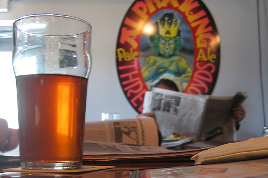 And a strange thing happened while I was drinking that beer. So there I am, eating lunch (this isn’t a foodie web site, but the eats at the Three Floyds brew pub are actually pretty awesome—far better than plain old pub fare) and enjoying my kick ass bitter. As I lift the pint to take a sip, I notice out of the corner of my eye someone sitting at the far end of the bar eating, reading the paper, and drinking a beer. At first, I didn’t think much of it. Double take: it’s Michael Floyd, the owner. I watch as he finishes up his beer, pulls his gloves back on, and heads back into the brewhouse, back to work.