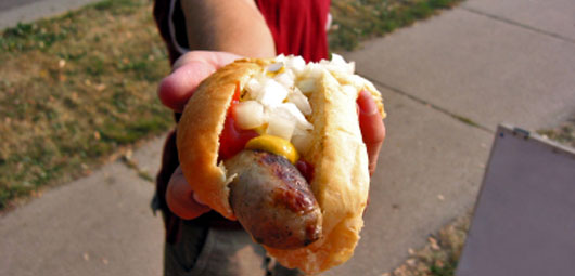 When ready to cook, pull directly from marinade and place on hot charcoal grill (do not cook prior to placing on grill?Nigel is a strong opponent of that technique). Dispose of marinade, as it has been soaking in raw meat and should not be used again (including onions and peppers). Cook thoroughly, place on bun, and add condiments as desired (Nigel recommends raw onion, ketchup, and spicy brown mustard).