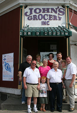 Doug “The Beer Guy” Alberhasky (far right) and family in front of John’s Grocery.